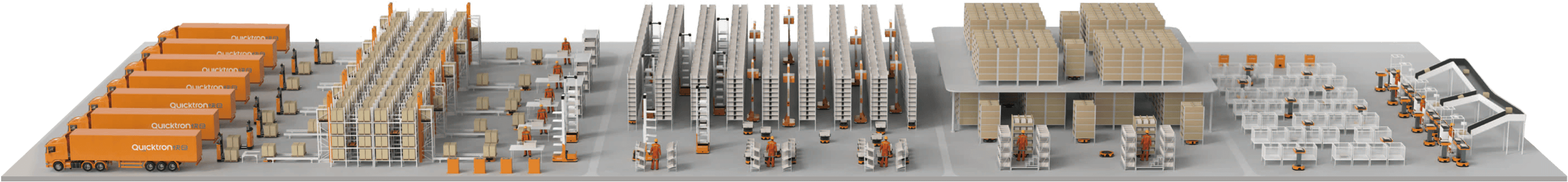 QuickBin is a modular Automated Storage and Retrieval System (ASRS). It's Quicktron’s patented Bin/Goods-to-person technology that optimizes warehouse operations by utilizing two types of robots and ensures unmanned/autonomous material handling. The combination of sturdy and efficient picking robots (Bin Pickers) with compact and agile moving robots (Bin Movers) enhances picking and bulk SKU handling efficiency.